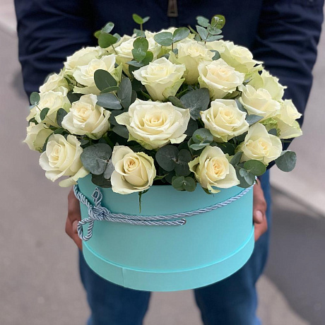 Состав: розы кения белые - 31 шт.; Коробка шляпная - 1 шт.; Эвкалипт - 3 шт.
