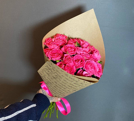 Состав: 9 розовых кустовых роз , упаковка, лента атласная