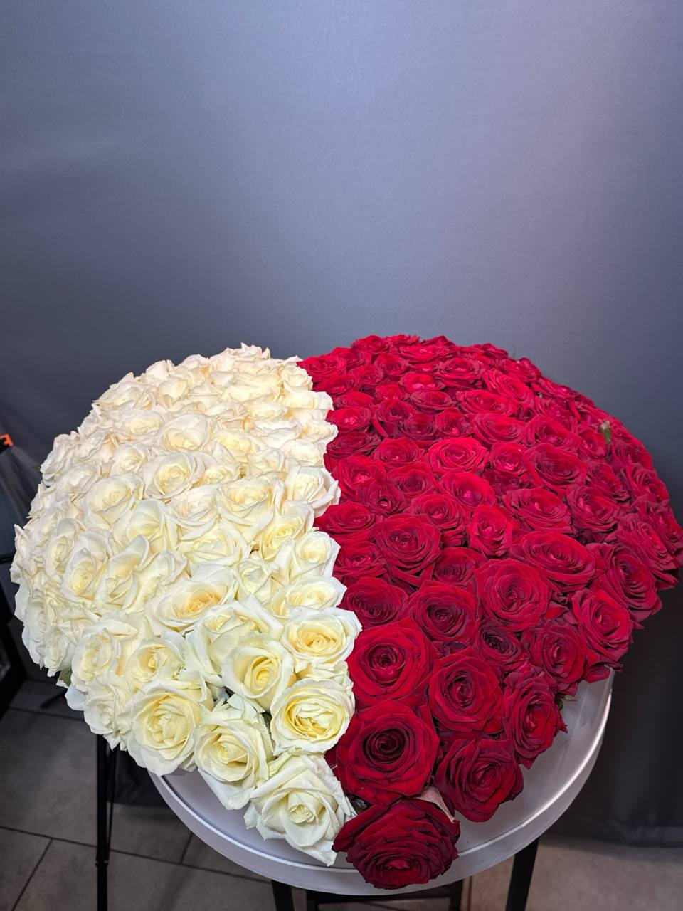 Состав: 75 красных роз, 76 белых роз, аспидистра, плетеная корзина