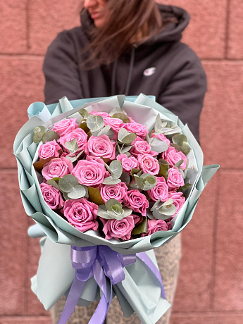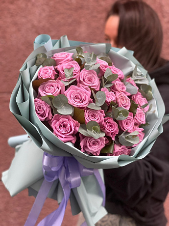 Состав: роза - 25 шт.; эвкалипт.; Лента атласная - 10 шт.