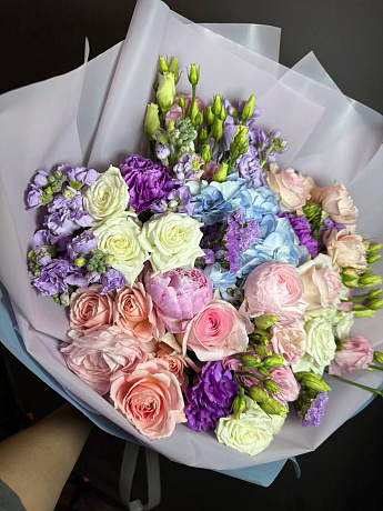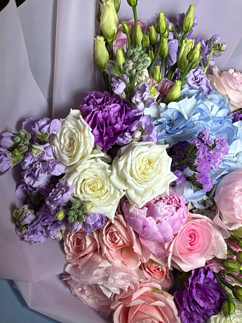 Состав: Гортензия 1, маттиола 3, пион 3, роза 50см. 3, эустома 3, роза белая кустовая пионовидная 4, лимониум 1, упаковка, лента