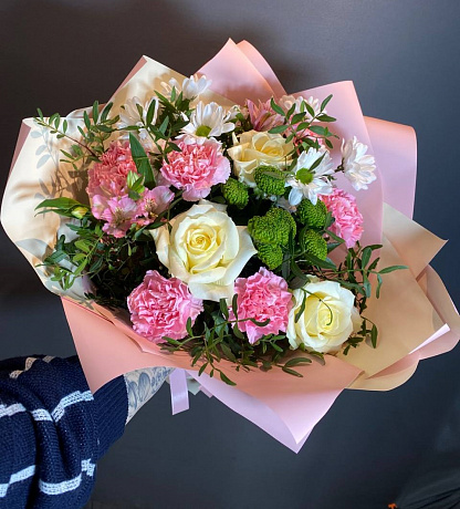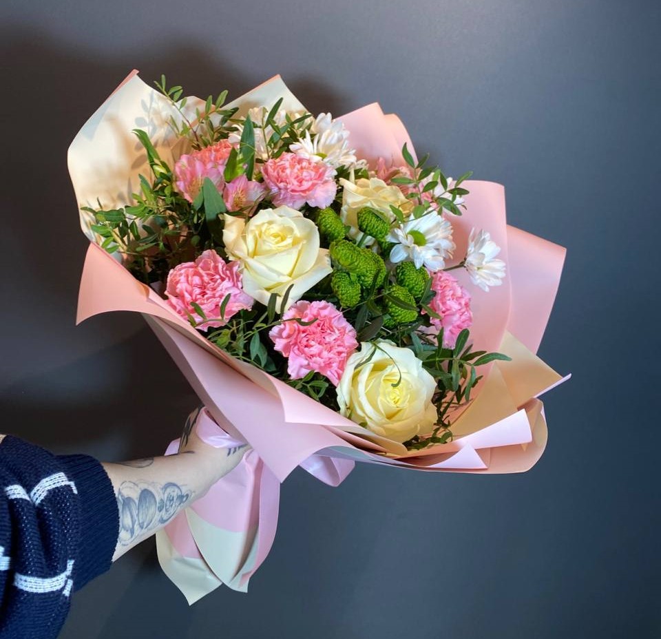Состав: Хризантема кустовая - 2 шт.; Сантини - 1 шт.; Гвоздика кустовая - 3 шт.; Писташ - 3 шт.; Гвоздика - 3 шт.; Альстромерия - 2 шт.; Роза - 3 шт.; Упаковка - 1 шт.; Лента атласная - 1 шт.