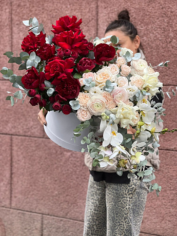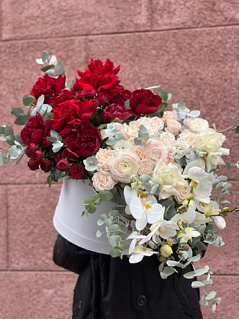Состав: Ранункулюс 3, гвоздика 6, роза эквадор 7, роза кустовая 7, фаленопсис 2, пион 5, эвкалипт, коробка