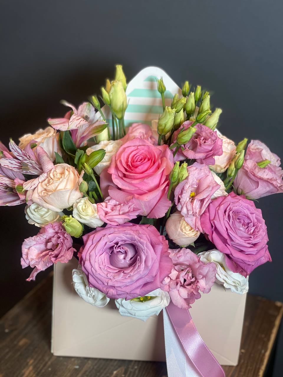 Состав: Роза маритим - 2 шт.; Роза Эквадор - 1 шт.; Альстромерия - 1 шт.; Эустома - 1 шт.