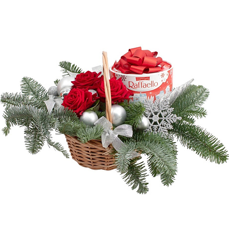 Состав: Нобилис, Красная Роза РЭД НАОМИ 3 шт шар новогодний 8 шт новогодний декор 1 шт банты корзина маленькая Оазис Конфеты Raffaello 200гр.