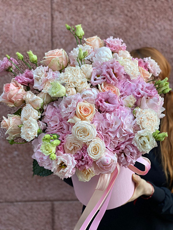 Состав: Гортензия - 3 шт.; Роза нюдовая - 8 шт.; Эустома - 5 шт.; Диантус - 10 шт.; Пион - 3 шт.; Роза кустовая - 10 шт.; Оазис - 2 шт.; Коробка шляпная - 1 шт. (Возможна замена пионов в не сезон)